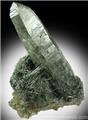 Hair-like crystals of green Actinolite needles up to 15 mm long at the base of a single Quartz crystal 5 cm long. The Quartz crystal has many internal inclusions of the green Actinolite. |