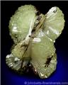Lustrous, transparent-to-translucent yellow-green Adamite crystals with remnants of brown Limonite gossan. The Adamite occurs in fan-shaped aggregates to 20 mm across, and fluoresces bright green under UV illumination. |