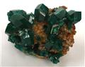 Scattered crystals of glassy and gemmy, intense green Dioptase, to 1.3 cm across, are emplaced on rhombs of colorless Calcite over a matrix of brownish-pink Dolomite. The color and texture contrast are remarkable. This is a fine miniature of one of the most classic minerals in the mineral world, probably from the 1970's finds. |